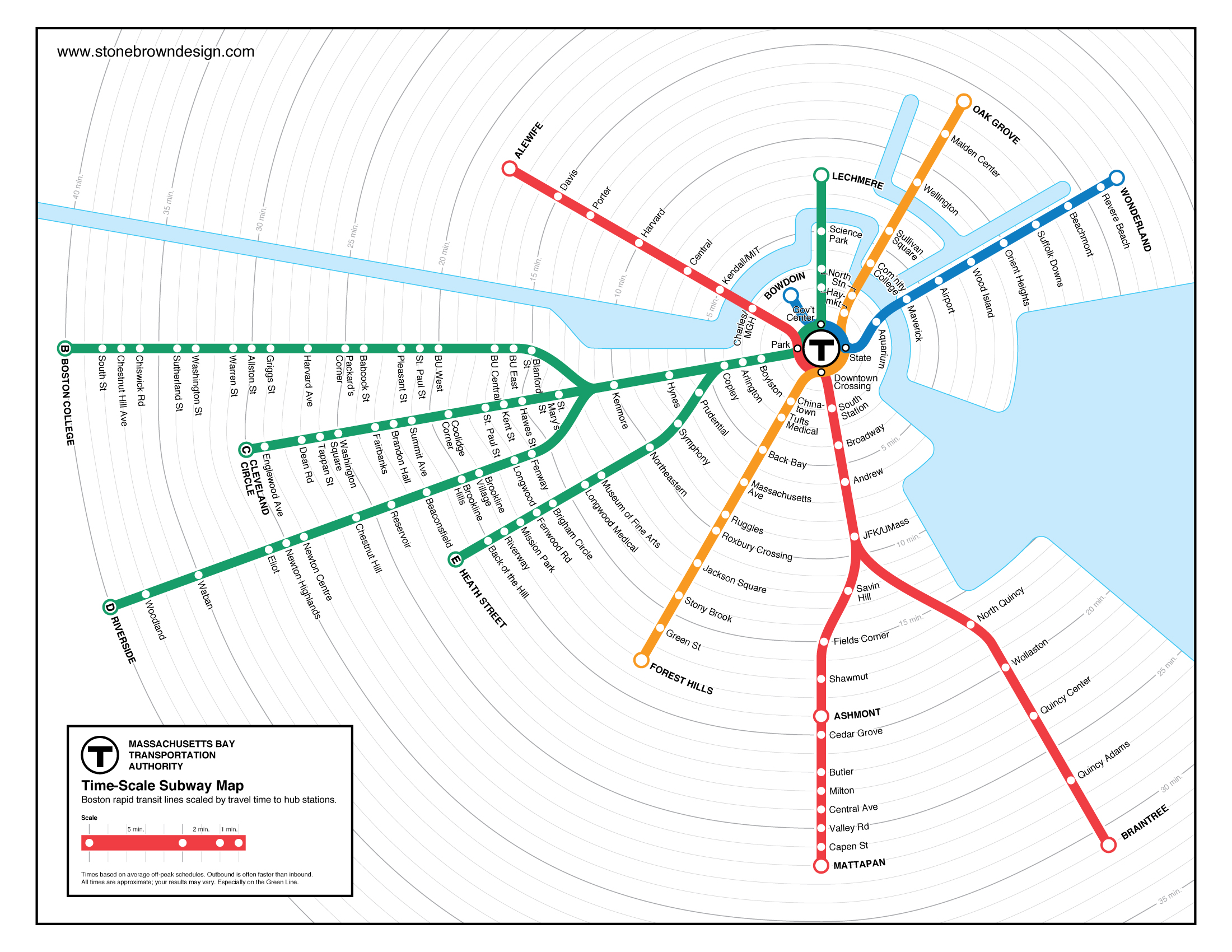 A graphic map of the Boston T with respect to time might look like this (here, drawn by Stone Brown Design):